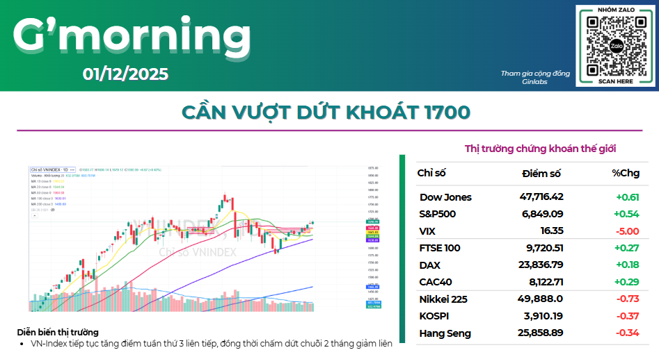 - VN-Index tiếp tục tăng điểm tuần thứ 3 liên tiếp, đồng thời chấm dứt chuỗi 2 tháng giảm liên tục khi kết thúc tháng 11 với sắc xanh dù cho là tăng đang chậm lại rõ rệt