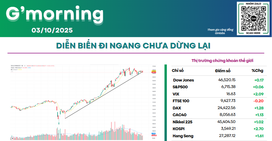 - Sự thận trọng từ NĐT còn duy trì để chờ đợi động lực mới từ mùa BCTC Q3/25 và thông tin nâng hạng, TT vẫn trong giai đoạn sideway – tích lũy – giữ nhịp nhờ trụ.
