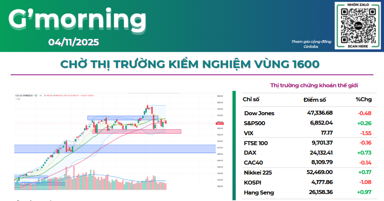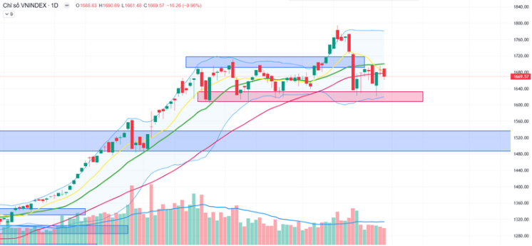 • Điểm tựa gần nhất của thị trường nằm ở vùng 1.600–1.620 điểm, tương ứng với đường cận dưới của xu hướng đi ngang từ giữa tháng 8.