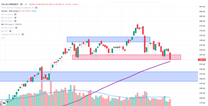- Nếu mất vùng hỗ trợ 1.580 – 1.600 điểm và áp lực bán gia tăng, thị trường có thể rơi vào nhịp sideway-down để kiểm định lại vùng 1500